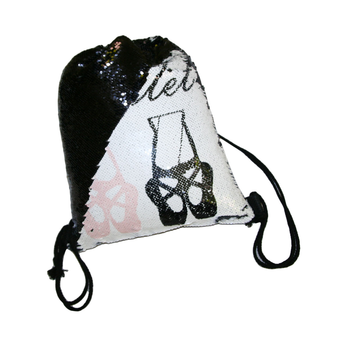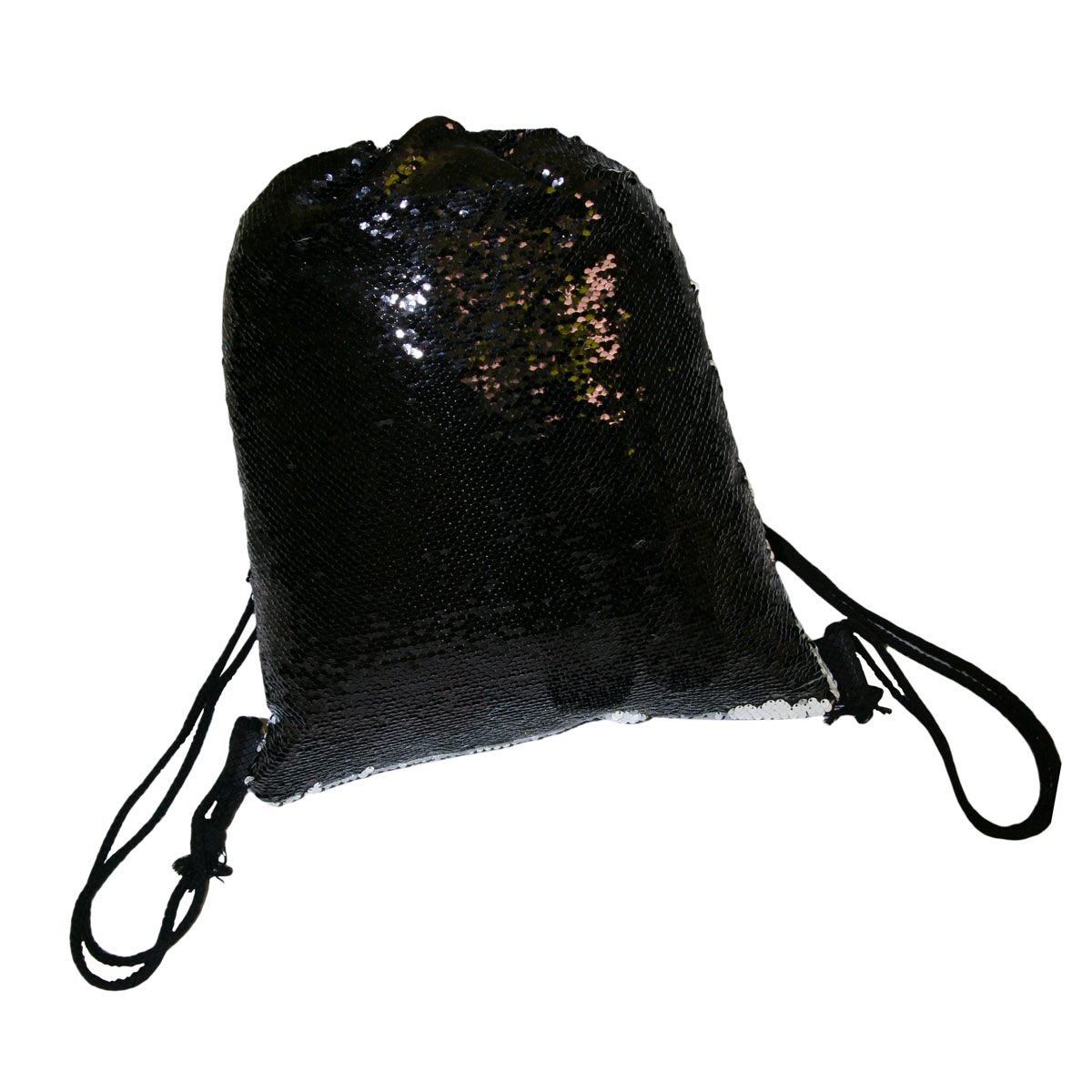 Worek do sublimacji w kolorze czarnym pokryty czarno-białymi cekinamiki po jednej stronie