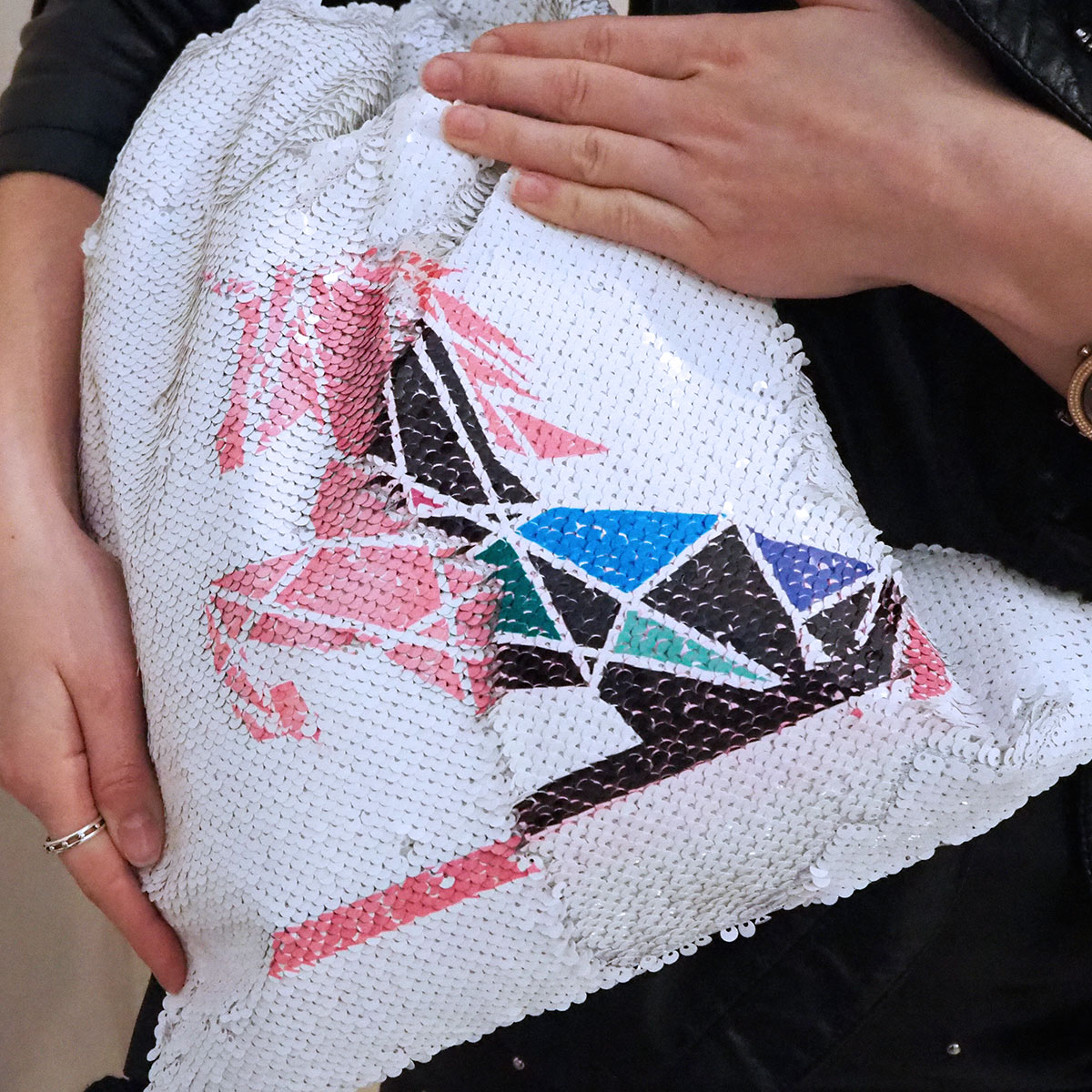 • Jednym ruchem ręki możemy zmienić nadrukowany wzór cekinowego plecaka, nosząc na zmianę raz jedną grafikę, a innym razem tę ukrytą pod spodem