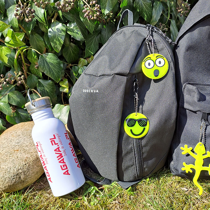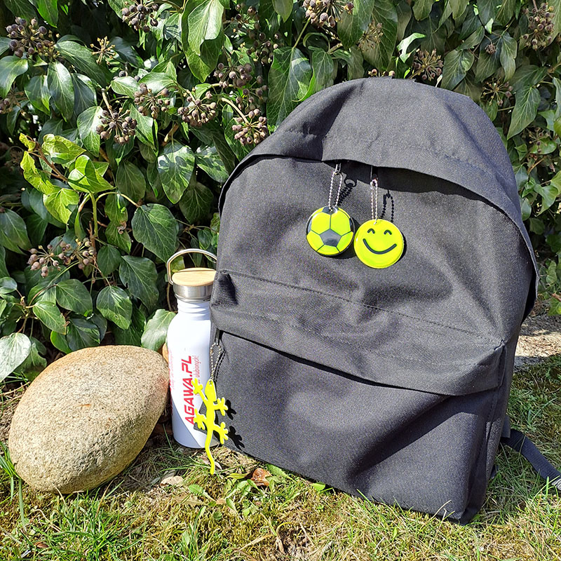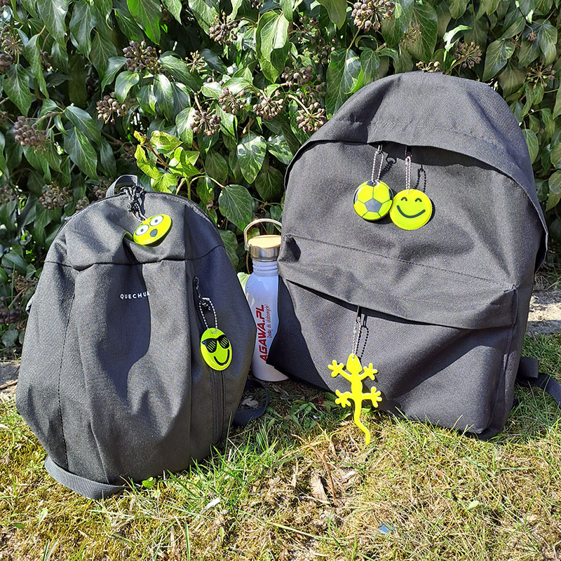 • Uniwersalne breloki odbijające światło z łańcuszkiem stanowią jednocześnie ozdobę i ochronę plecaka każdego dziecka