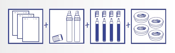 • 3 bloki papieru typu flipchart (w każdym po 20 gładkich kartek; możliwość zawieszenia bloku na flipcharcie lub na zwykłej tablicy zaopatrzonej w specjalne uchwyty)