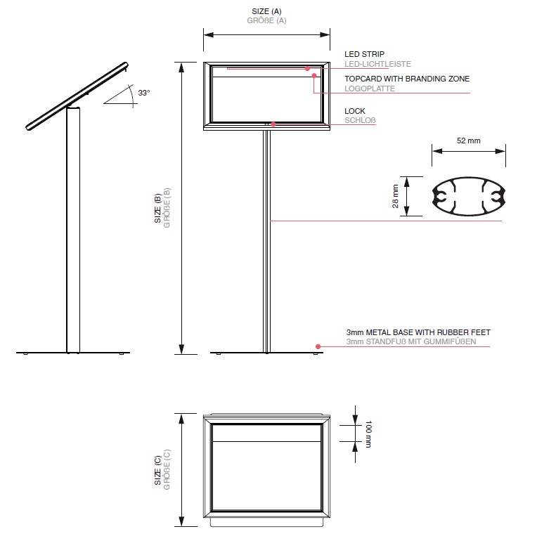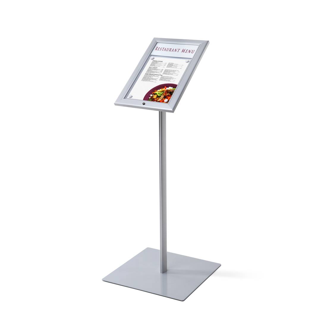 • Wolnostojący stand reklamowy składa się z zamykanej ramki na menu w formacie A4 (210 x 297 mm) oraz aluminiowej anodowanej nogi, osadzonej na podstawie z czterema gumowymi nóżkami