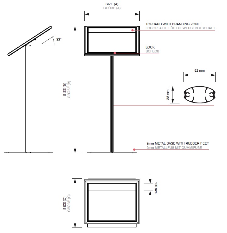 • Wolnostojący stand reklamowy składa się z zamykanej ramki na menu w formacie 2 x A4 (297 x 420 mm) oraz aluminiowej anodowanej nogi, osadzonej na podstawie z czterema gumowymi nóżkami
