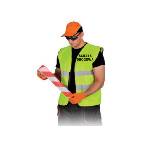 • Kamizelka ostrzegawcza (fluorescencyjna) pod zadruk w dolnej części posiada dwa poziome odblaskowe pasy,dobrze widoczne z dużej odległości; kamizelka jest zapinana na rzep